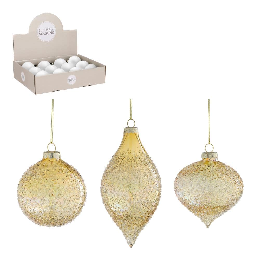 This assorted gold glass ornament in the shape of an onion drop ball, measuring 8 cm, adds a touch of sophistication and sparkle to your holiday decor. Its gleaming gold finish and distinctive shape make it a perfect addition to your Christmas tree or festive displays.