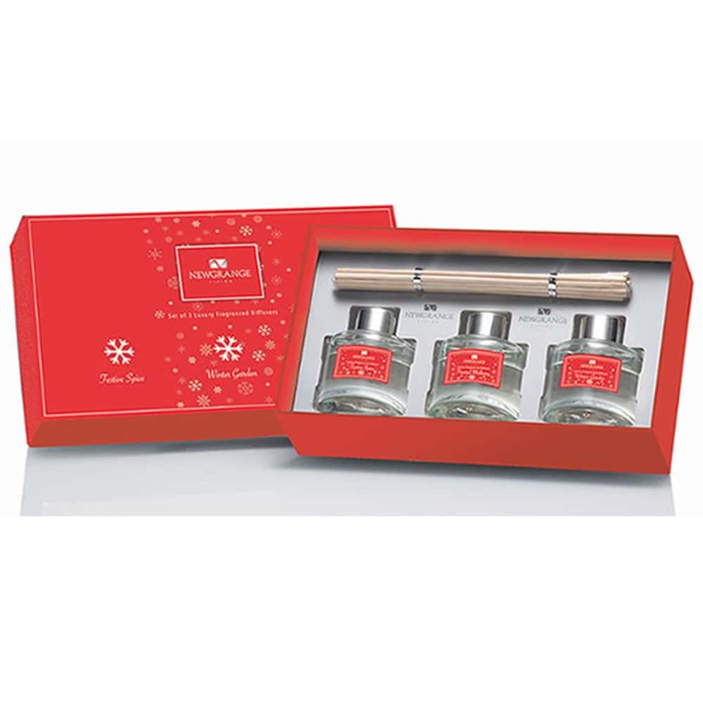This stylishly presented luxury scented diffuser set of 3 (Festive Spice, Winter Garden and Frosted Mulberry) brings all the atmosphere of Christmas into your home. Or why not spoil someone special with the perfect seasonal gift that is beautifully presented. Diffuser jars comes with an elegant silver tassel neck attachment. Diffuser capacity: 100 ml.